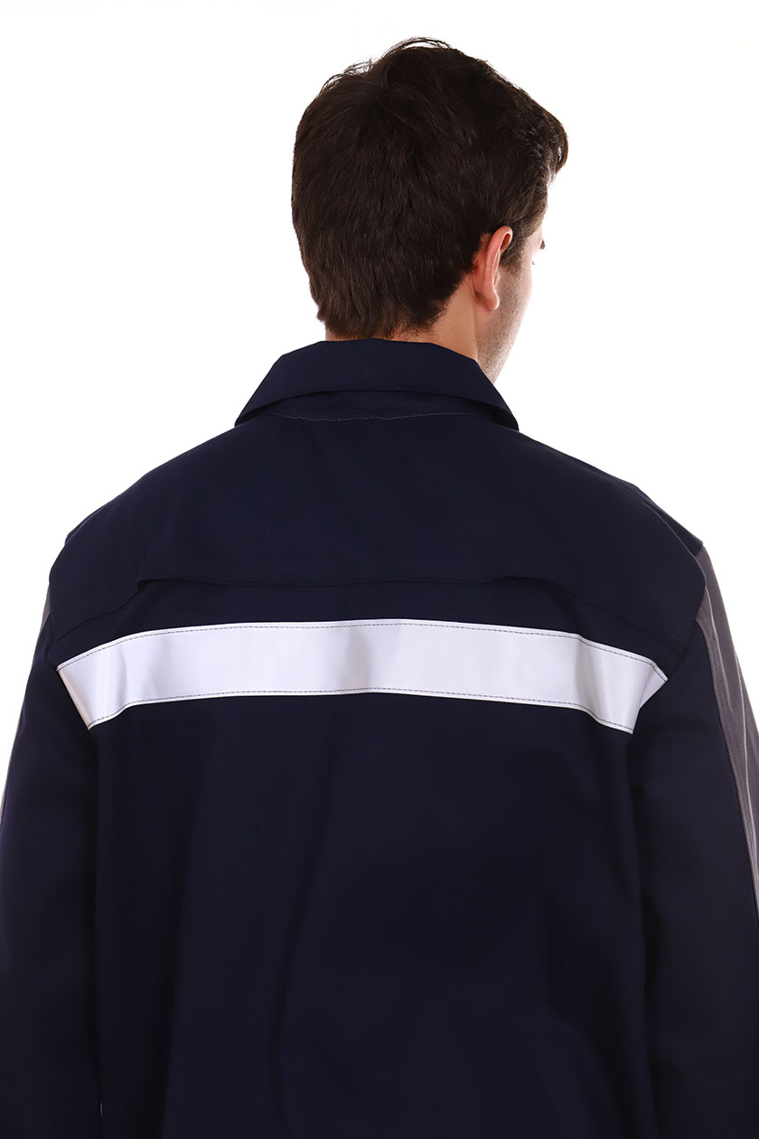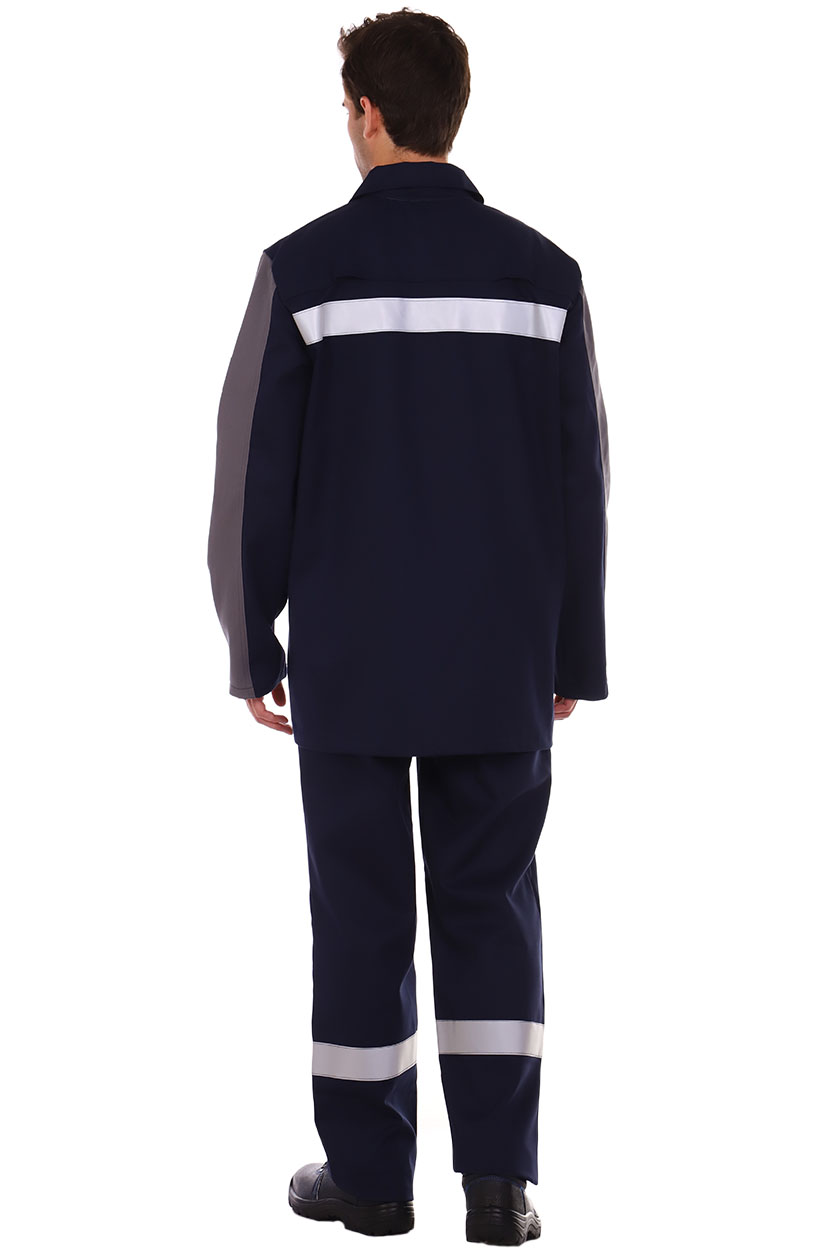 ➠ Куртка прямая с потайной застежкой на пуговицы. Полочки с рельефными швами, с боковыми вертикальными карманами. На левой полочке внутренний накладной карман. Спинка с вентиляционными отверстиями в швах притачивания кокетки. Рукава трехшовные. В верхней части боковых швов, под проймами обработаны вентиляционные отверстия. СОП 50 мм расположен по шву притачивания кокетки к спинке. СОП огнестойкий. Брюки с притачным поясом, застежка гульфика на пуговицы. На правой передней половинке – накладной карман с клапаном.